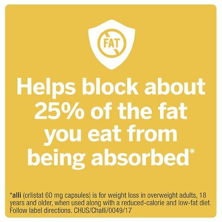 Alli Orlistat Weight Management Capsules are designed to aid in weight loss for overweight adults aged 18 and older. Each capsule contains 60 mg of orlistat, a lipase inhibitor that works by reducing the absorption of dietary fat in the intestines. When used in conjunction with a reduced-calorie, low-fat diet, Alli can help individuals lose 50% more weight than with dieting alone. This package includes 120 capsules, providing a convenient supply for your weight loss regimen.