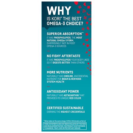 Kori's Pure Antarctic Krill Oil delivers Omega-3 essential fatty acids EPA and DHA in their most natural form, similar to a healthy fish diet. This supplement supports various aspects of health, including heart, immune, brain, joint, eye, and skin health. The formula contains phospholipids for efficient Omega-3 distribution, choline to support brain and nervous system health, and astaxanthin, a natural antioxidant responsible for the oil's red color.
